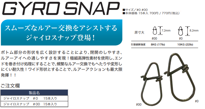 ボトム部分の形状を広く設計することにより、閉開のしやすさ、ルアーアイへの通しやすさを実現!極細高弾性素材を使用し、エンドを巻き付け処理にすることで、頻繁なルアー交換でもへたりや変形しにくい耐久性!ワイド形状とすることで、ルアーアクションも最大限発揮!!