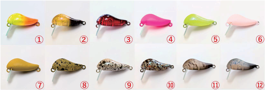 ①ダリアグロー②フレイムG③レッドバグ④蛍光ピンク⑤グリーニー⑥薄桜⑦からし色⑧カーキ60⑨グリンピ⑩ペレットモア⑪リンダ⑫ウララ